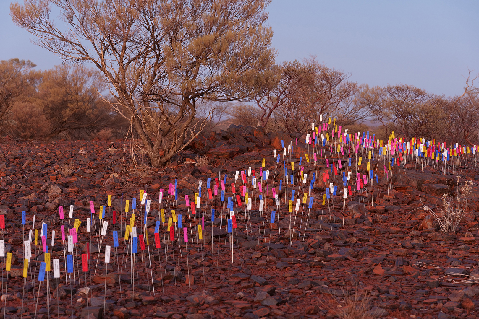 Above: Allegories of subjugation and the laughable delusion that political and mining governance can bring ‘the environment’ under ‘their’ control (2020). A colourful intervention of space, fifty survey pickets, each with a ribbon of flagging tape. Jack Hills, Wajarri Yamaji Country, Western Australia.